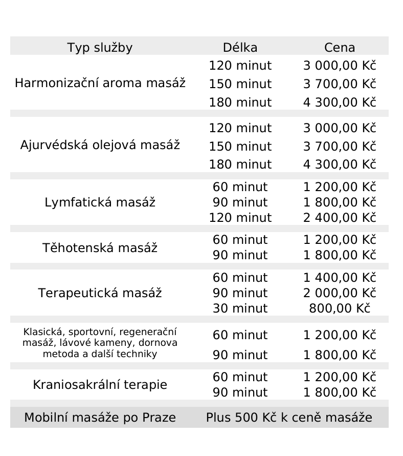 Délka částečné masáže je 60 minut, celotělová trvá 110 – 120 minut.
